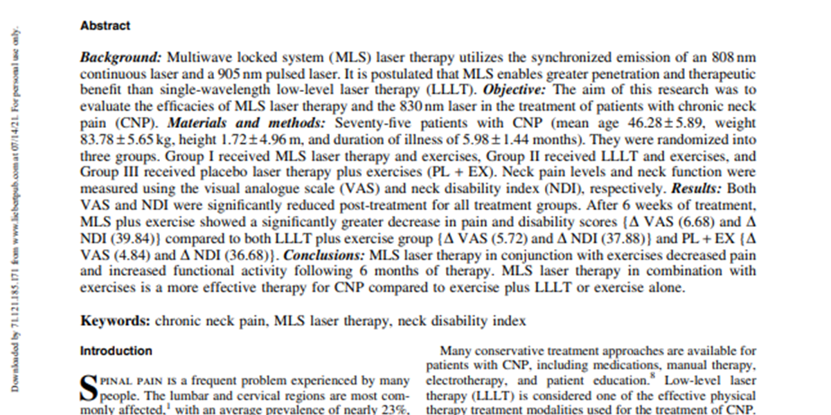 Multiwave locked system (MLS) laser therapy utilizes the synchronized emission of 808nm continuous laser and a 905nm pulsed laser, in such a way that it is postulated that MLS enables greater penetration and positive clinical outcome than single-wavelength low-level laser therapy (LLLT). This synchronized emission also works to avoid the associated heat build-up present in other class 4 laser systems. The following randomized placebo-controlled trial, worked to assess the efficacy of MLS laser therapy and exercise in comparison to LLLT therapy and exercise, and a placebo and exercise control group. The results of this study showed that over a six-week period both VAS and NDI decreased across all treatment groups, but MLS saw a significantly greater decrease in pain and disability scores. “MLS laser therapy in combination with exercises is a more effective therapy for CNP compared to exercise plus LLLT or exercise alone"