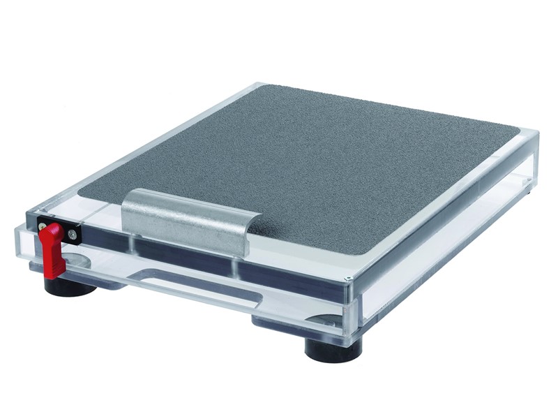 This product is a full protection box made of 15mm polycarbonate material that can withstand up to 650Kg while in standing position during weight-bearing foot exposures. The top surface comes with a translucent anti-slip surface. A lock secures the opening of the insert.