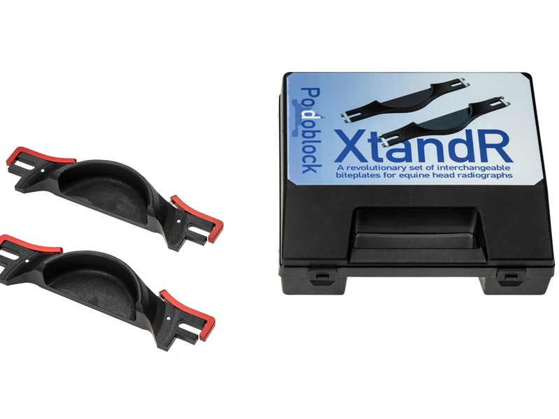 The XtandR is a revolutionary set of interchangeable radiolucent bite plates for equine head radiographs. The XtandR is only intended for taking X-rays of the incisors. They are entirely universal to fit all speculi available in the market. According to the official DAkkS-DKD-R 3-3 regulation, these radiolucent bite plates have been tested and can withstand a pressure of 5,13 kN / 513 kg.